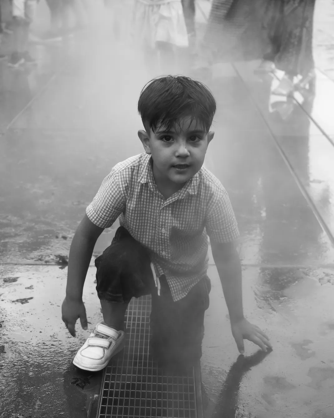 I captured this photo in Paris, Place de la Republique, where mist is being used during summer times to refresh passer-by. This kid was playing with it, as much as chasing my camera.