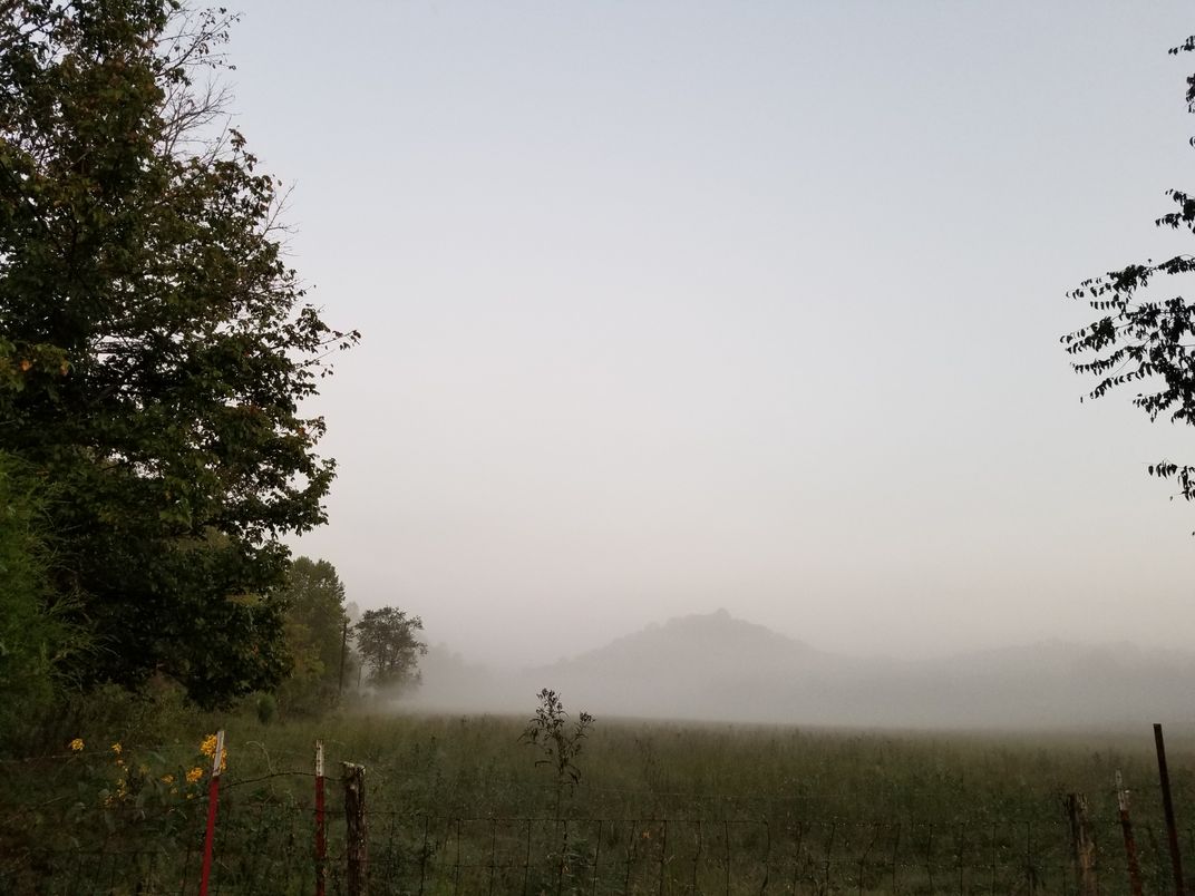 Foggy morning in the field next to the house.