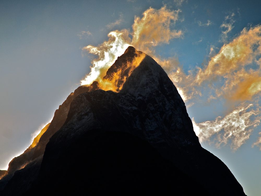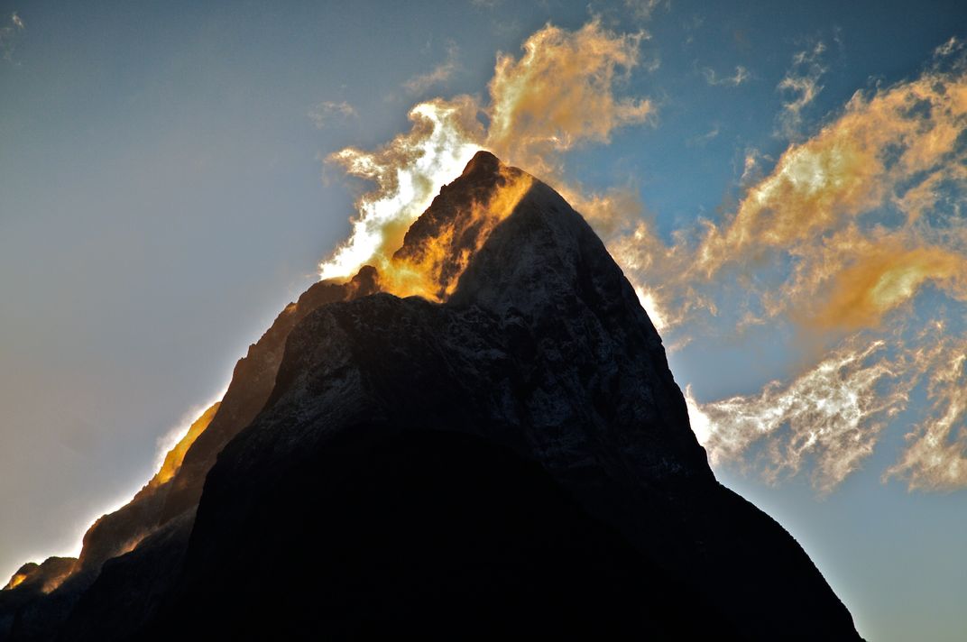 Mitre Peak in Milford Sound on New Zealand's south island lights up at sunset.