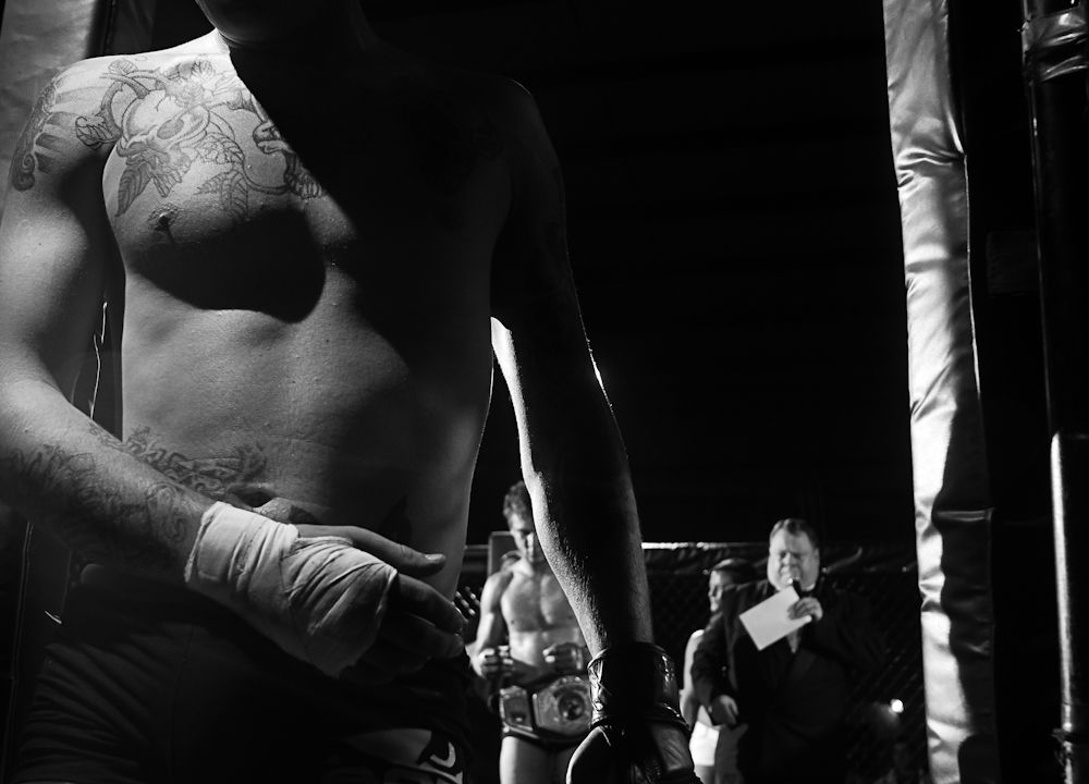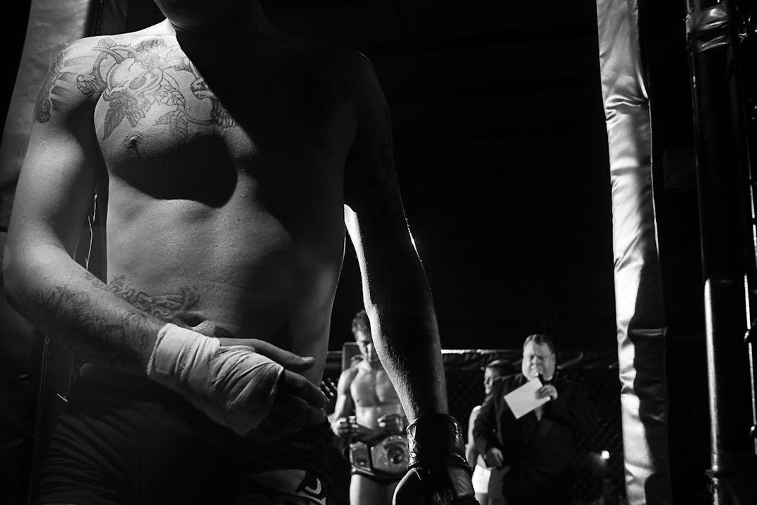 Mixed Martial Artist Brandon Slabaugh exits the cage in the 4th round of an amateur title fight after breaking his hand while striking. Slabaugh was winning the fight 3 rounds to 1, but had to forfeit