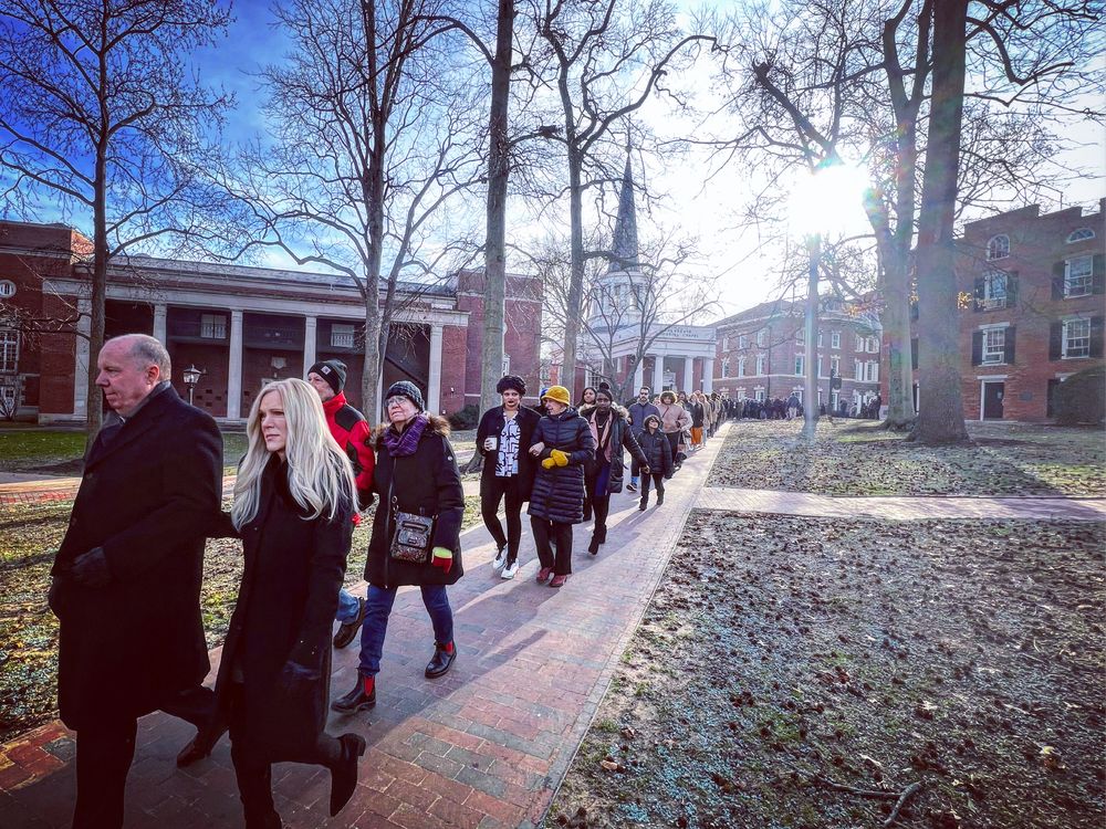 A line of people marches across the brick walk of Ohio University's historic College Green, participating in the annual Martin Luther King Jr. Day commemoration. The cold winter sunlight and bare trees frame Galbreath Chapel and the surrounding landmark buildings.
