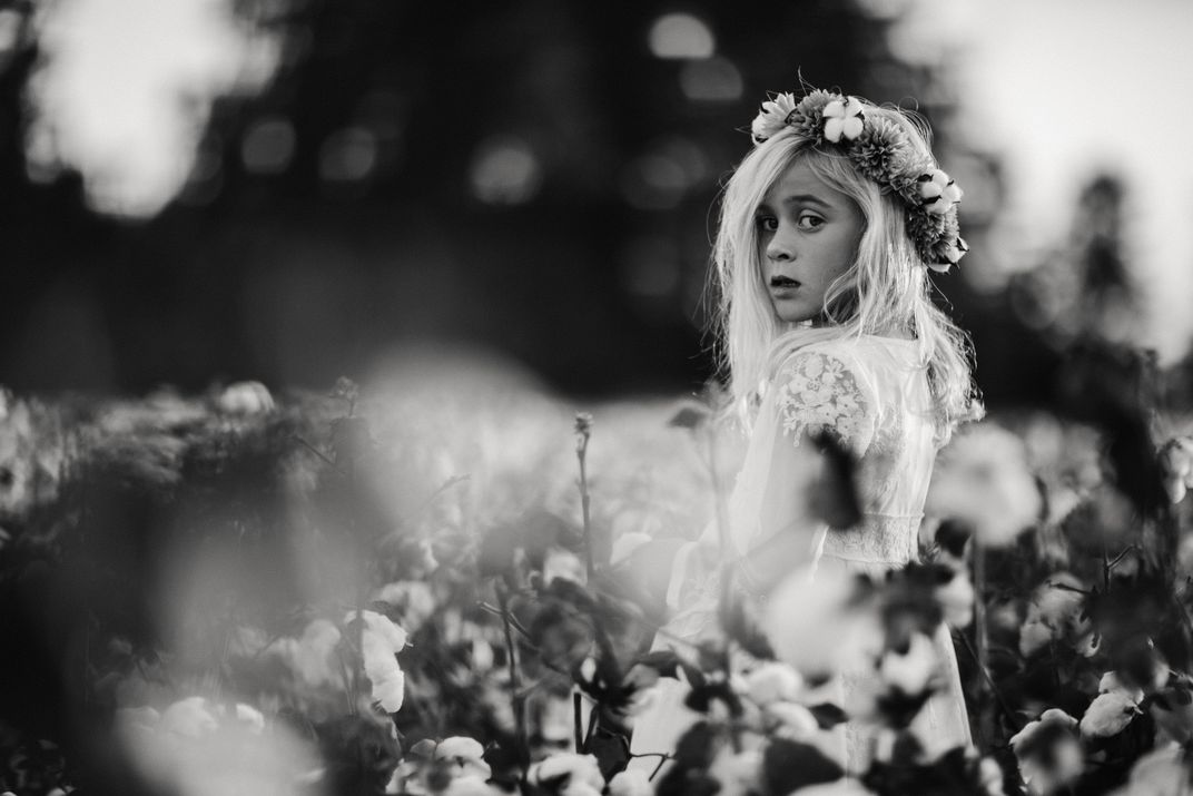Farmer's daughter in the middle of a cotton field.