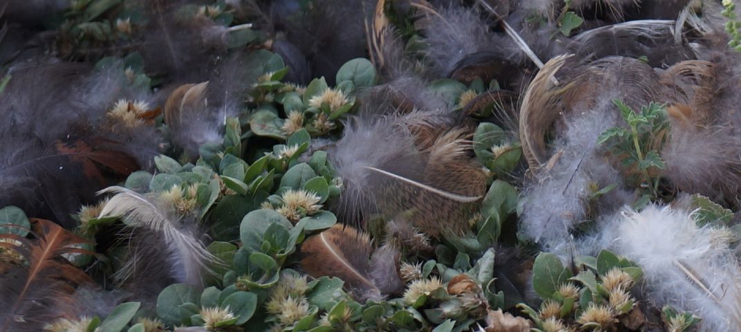 Feathers and Burrs. The "flowers" on the khaki burr weed look soft, like the feathers, but they trick you because they are really stickers!