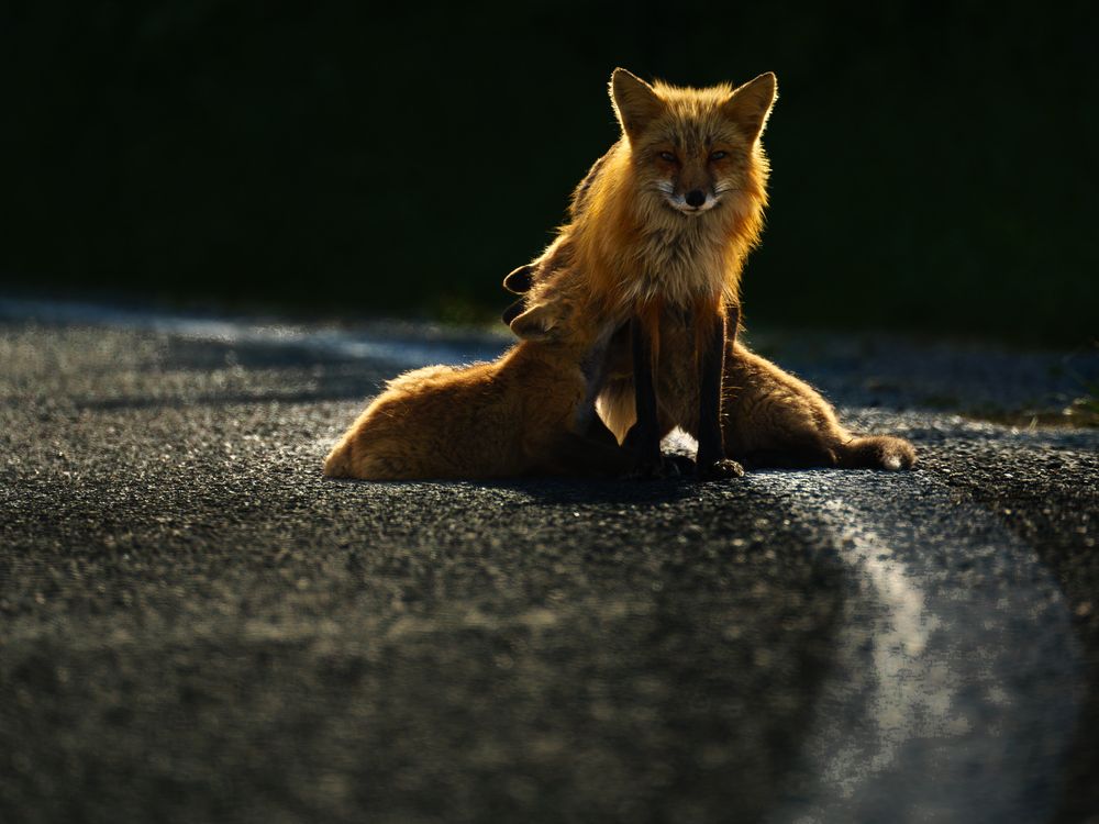 A momma fox feeding her kits on the side of a dead-end road. Her den is on the side of the road to keep her kits safe from local Bald Eagles. The foxes stay on the outskirts of human habitation to keep their dens safe from the Bald Eagles, who mostly stay away from the human habitation.