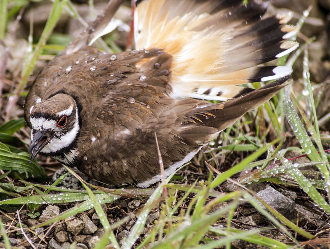 Here in Kentucky we have a bird called a "Kill Deer." They lay between 2-4 pretty big speckled eggs. Which you can see part of one just below her chest. They make their nest on the ground. Which blends in quit well. When she is laying on them 24/7 right before they hatch, she gets defensive and expands her tail feathers and squawks at the predator.