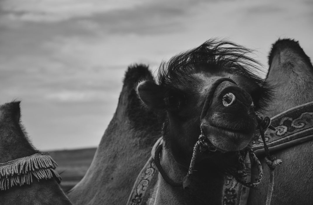 A camel found on the side of the road on the edge of the Gobi desert, an extremely lopsided face gave him lots of character.