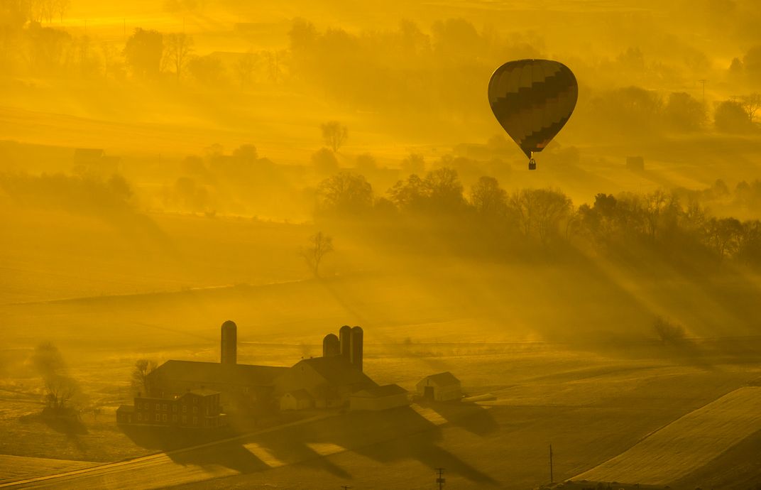 A hot air balloon floats over an amish farm in the Pennsylvania farmlands on a foggy morning