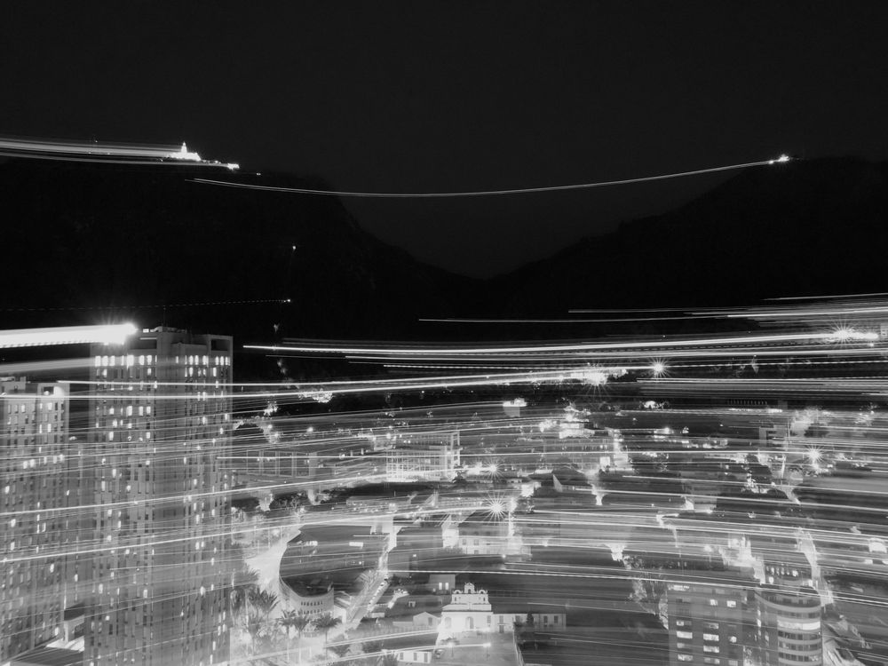 A black-and-white long-exposure photograph of Bogotá’s night lights from the 33rd floor of Torre Ventto in La Candelaria — a moment that captures the city’s respiration through its lights, a luminous farewell to the place that has always inspired my happiness.