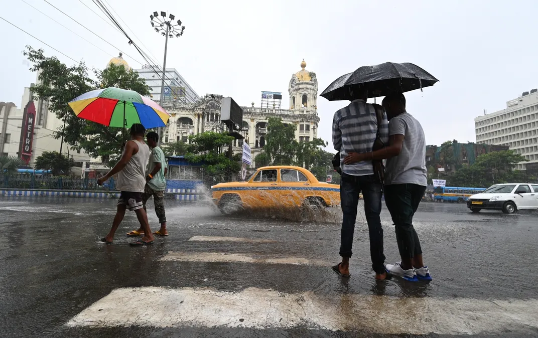 Dull sky, the iconic yellow taxi of Kolkata splashing water, four people in two pairs- a monsoon cityscape.