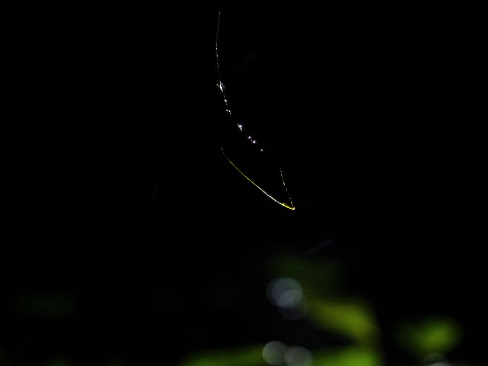 An arboreal Wine Snake caught mid-slither, illuminated by a fierce backlight in the heavy rain. Every drop and detail on its skin is transformed into a sparkling outline, contrasting sharply with the deep darkness of the night jungle. A fleeting moment of luminescence.