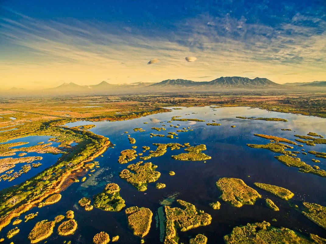 A drone's eye view reveals the ancient dialogue between a tranquil lake and the monumental volcanoes. The aerial perspective frames nature's powerful geometry: water's calm reflection against the earth's fiery, dormant peaks. It’s a study in scale and timeless majesty.