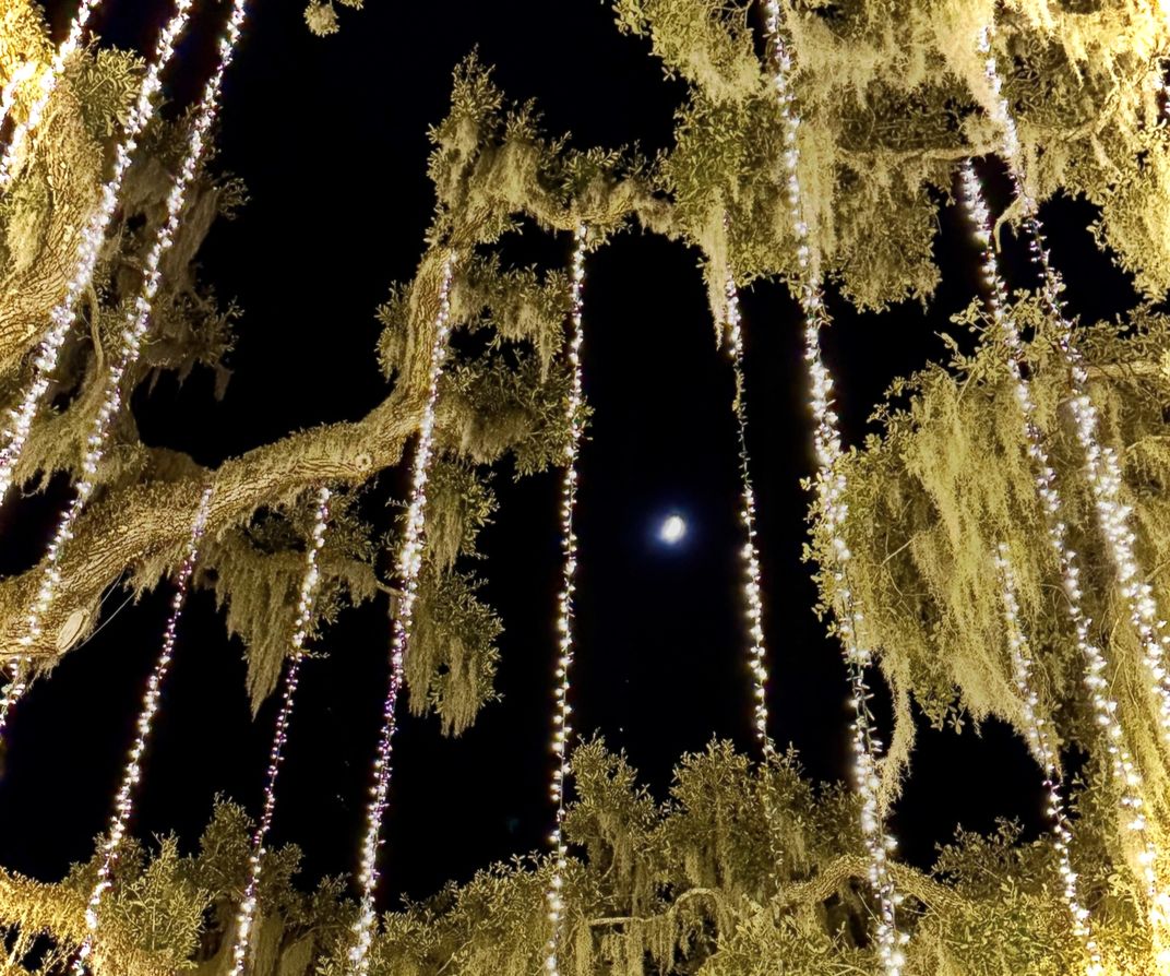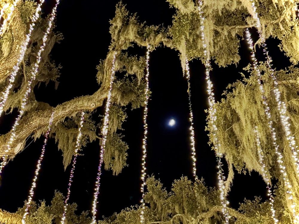A canopy of ancient oaks draped in Spanish moss glows under strands of holiday lights, with the moon suspended perfectly in the night sky.