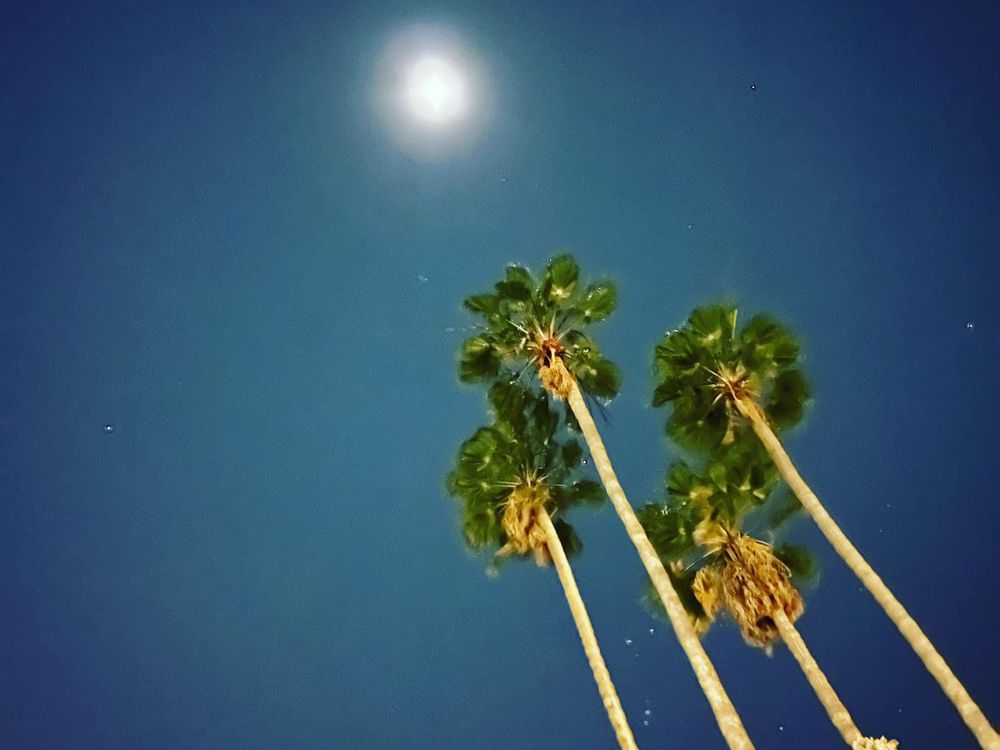 Towering palms reach toward a glowing moon on a warm California night.