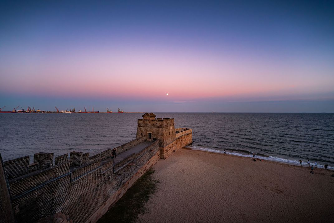At Shanhaiguan, where the Great Wall meets the Bohai Sea, twilight colors the sky in bands of blue and pink. The Old Dragon Head fortress reaches into the water as the full moon rises above the distant port cranes.