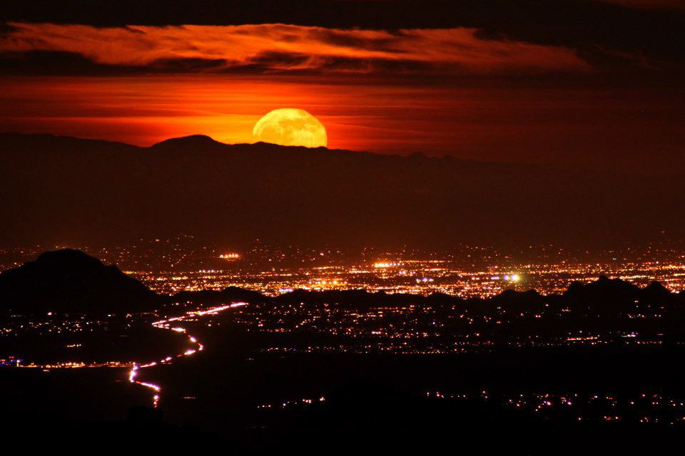 Moonrise over Tucson, Arizona seen from Kitt Peak National Observatory Two images stacked in Photoshop to prevent the moon from being over exposed or the city from being under exposed. Both images taken on the same night from the same location.