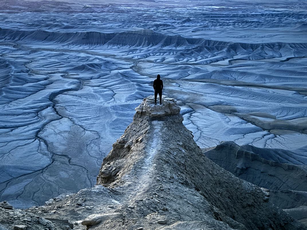 This is a self portrait at the edge of the Moonscape Overlook in Utah at sunrise.