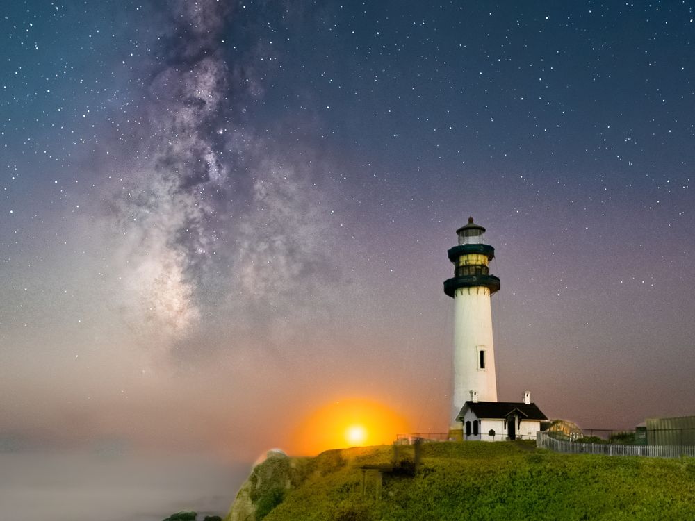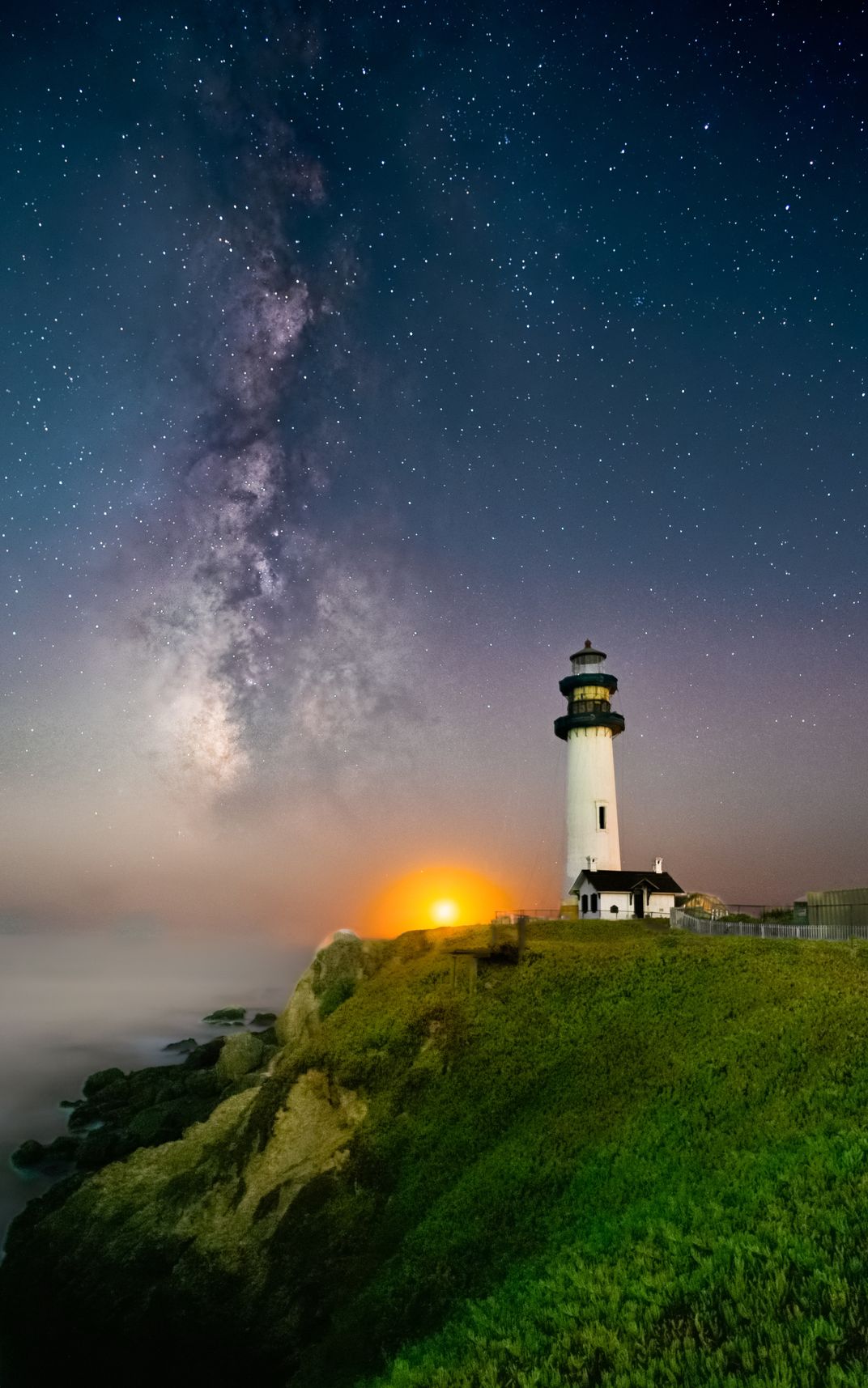 The milky way behind the Pigeon Point Lighthouse in Pescadero, CA. I call it "Moonshine" because the setting moon helps creates a unique almost ethereal image. My plan was to capture the milky way after the moon set. I had a small window of about 45 minutes between moonset and the milky way core dropping below the horizon. Capturing the moon in the picture was unplanned. I took a test shot and really liked how it represented the moment.