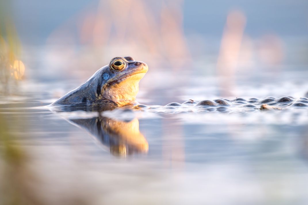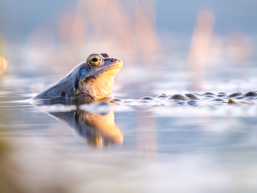 Moor frog has an eye on his spawn