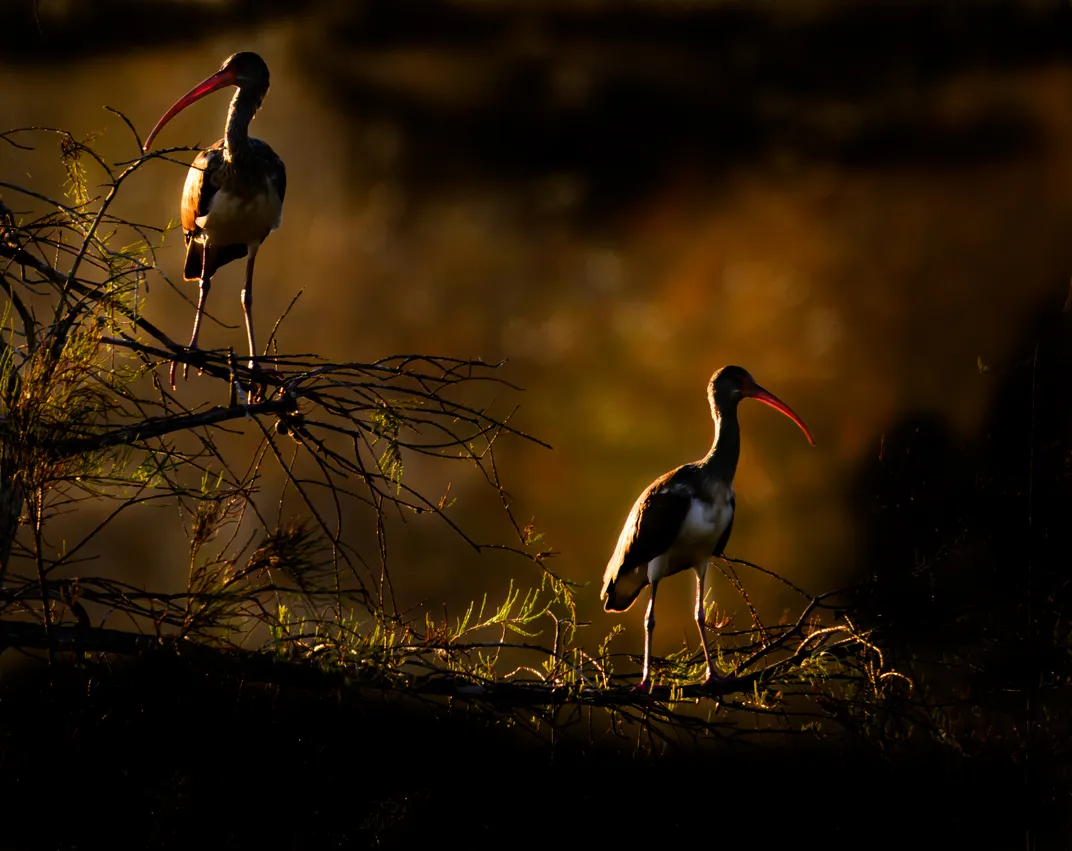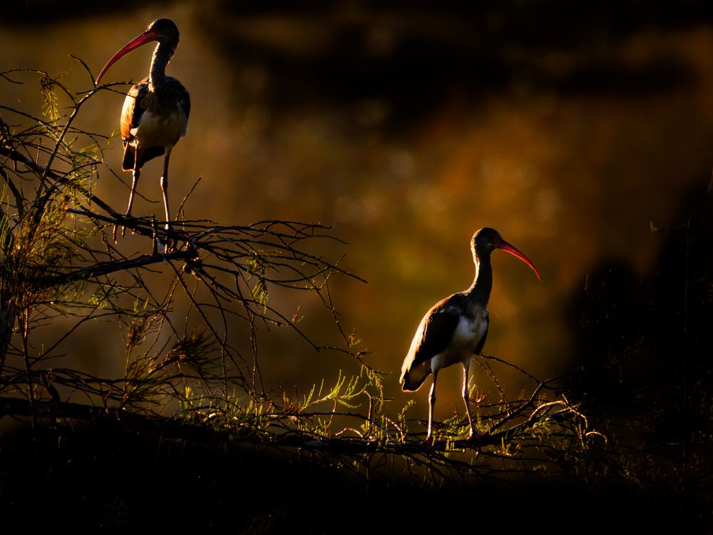 The shot was taken just as the sun was rising in southern Florida. There was a flock of Ibises in a field. These two were on a slight rise in the field.