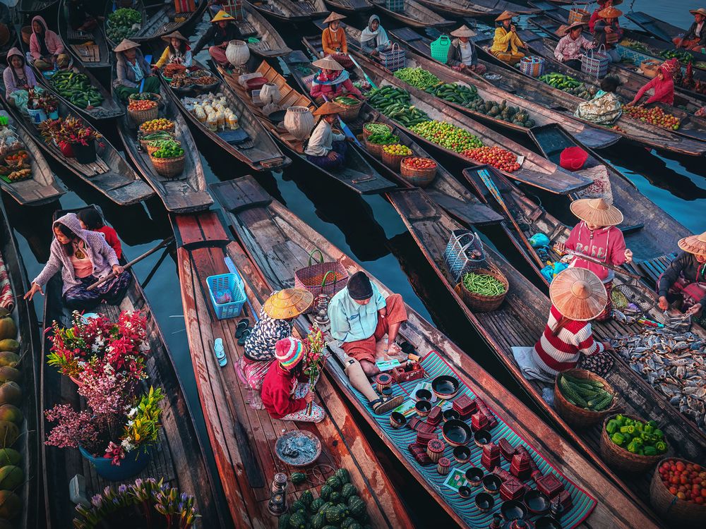 At dawn, vendors gather on wooden boats to trade flowers, produce, and handmade goods on a calm river. The market becomes a moving mosaic of color and culture, a glimpse into daily life in one of Southeast Asia’s most vibrant floating communities.