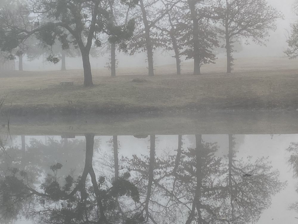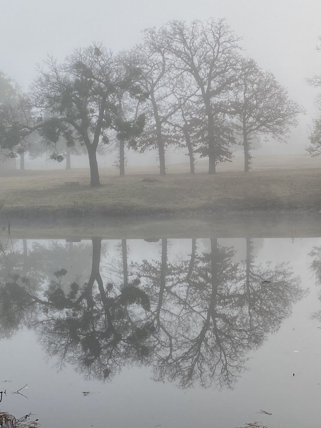 View of misty morning at the Duck Point in Norman, Oklahoma. Reflections of several trees are visible in the water.