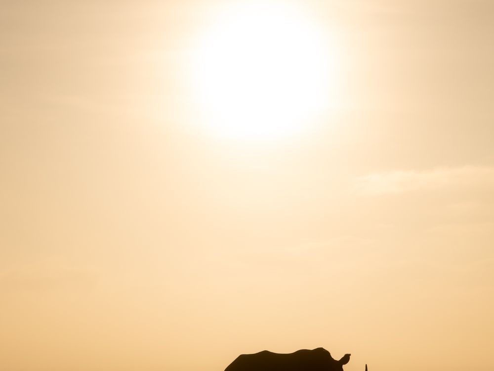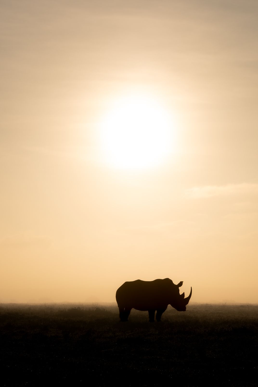 White rhino stands in front of the rising sun as fog and mist rise from the ground.