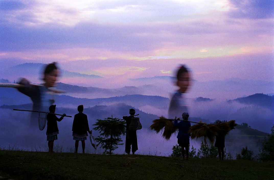 The hard-working mountain people are out working in the fields just after dawn. The dynamic shadows indicate swiftness, seizing the time to work, while the static indicates that they happen upon a beautiful view and they stop to admire it. A combination of movement and stillness. For city dwellers, this idyllic life of working at sunrise and returning at sunset is most envied.