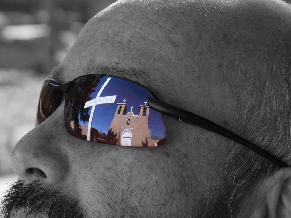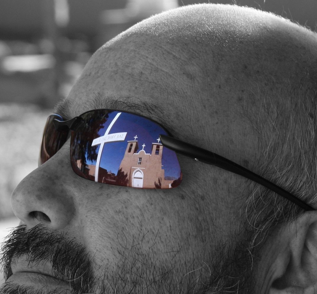 Morning reflection of San Francisco de Asis Church in Taos, New Mexico. Seen through the eyes of my husband; his gaze captured on his sunglasses.
