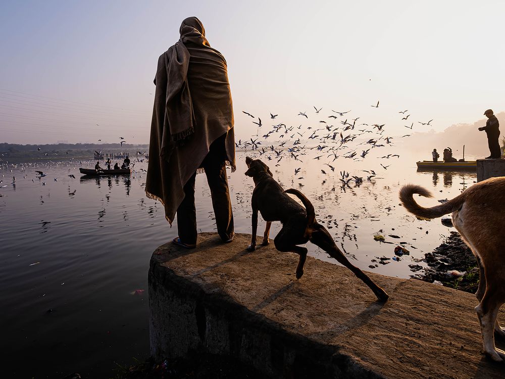 A man and his dogs stand at Yamuna Ghat at sunrise, watching the birds rise in a storm of light. This quiet daily ritual blends people, animals, and river life into a single moment of calm and connection.