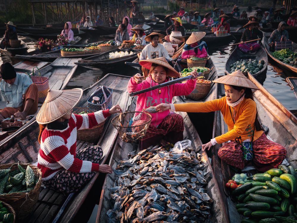 Women at Inle Lake’s floating market trade dried fish and vegetables at sunrise, leaning across narrow wooden boats in a daily ritual that sustains their families and reflects the rhythm of life on the water.