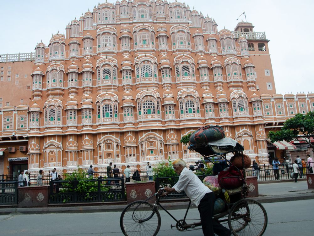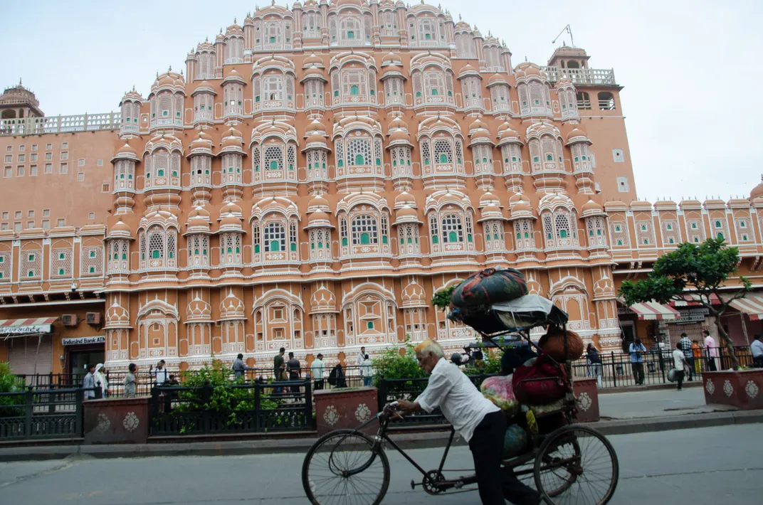 in the morning time life graph of life begins slowly and people starts moving . one the rickshaw puller takes loads of vegetable in front of landmark hawa mahal in the morning time