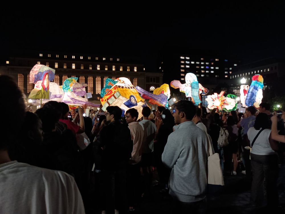 People gather around in a parade of lights and lanterns through Morningside Park.