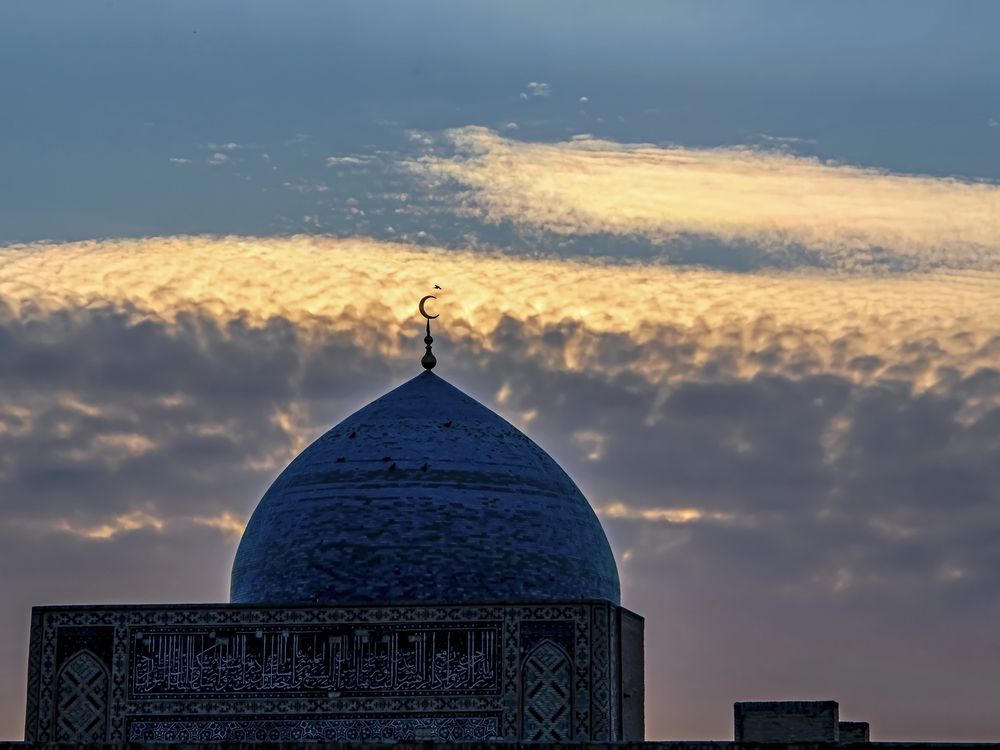 In the evening, a colorful cloud appeared on the horizon against the ancient mosque