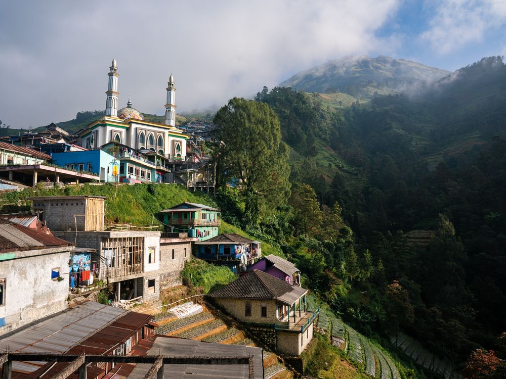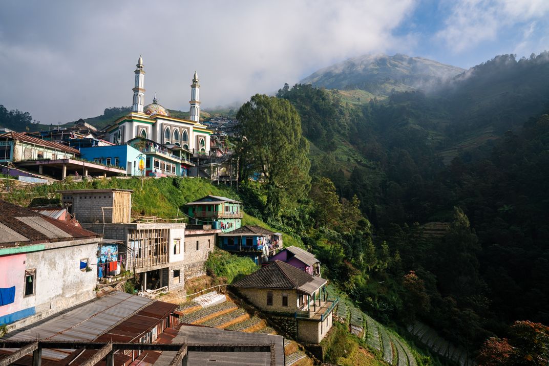 Showing the mosque of Nepal Van Java from a different angle. The community sits under a dormant volcano. They have painted the town in bright colours to attract tourists and bring more money into the community