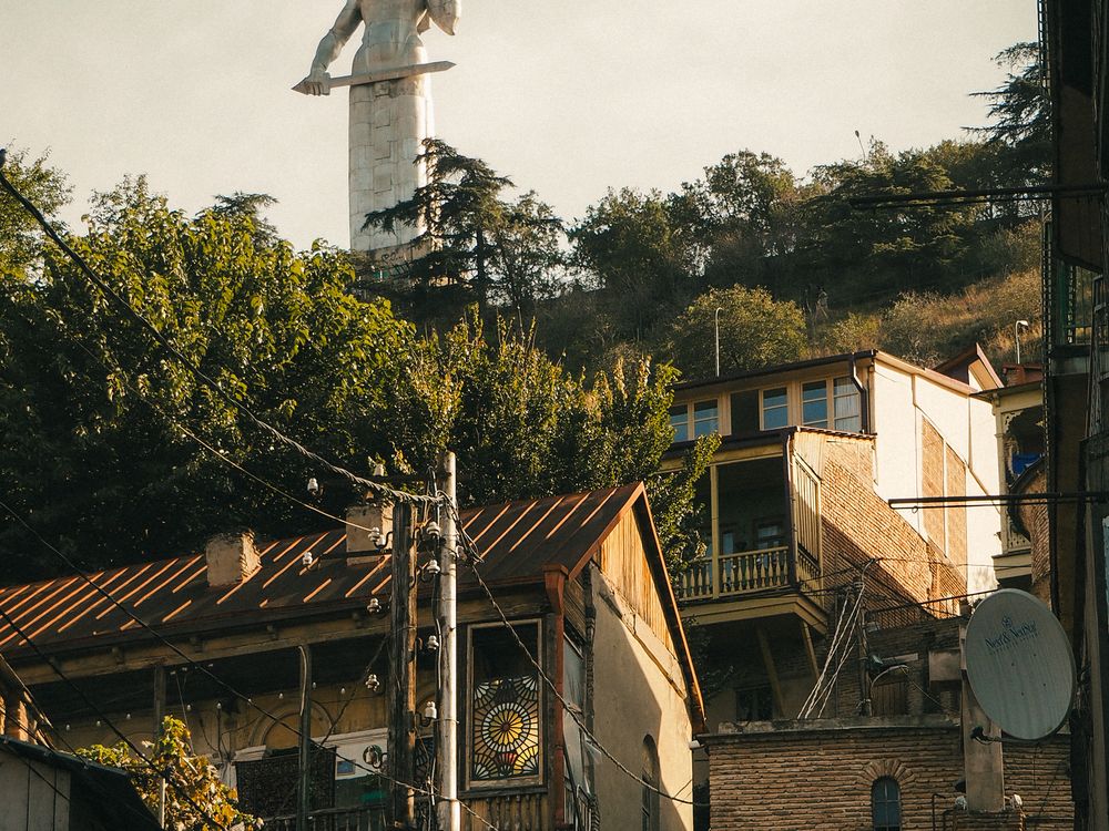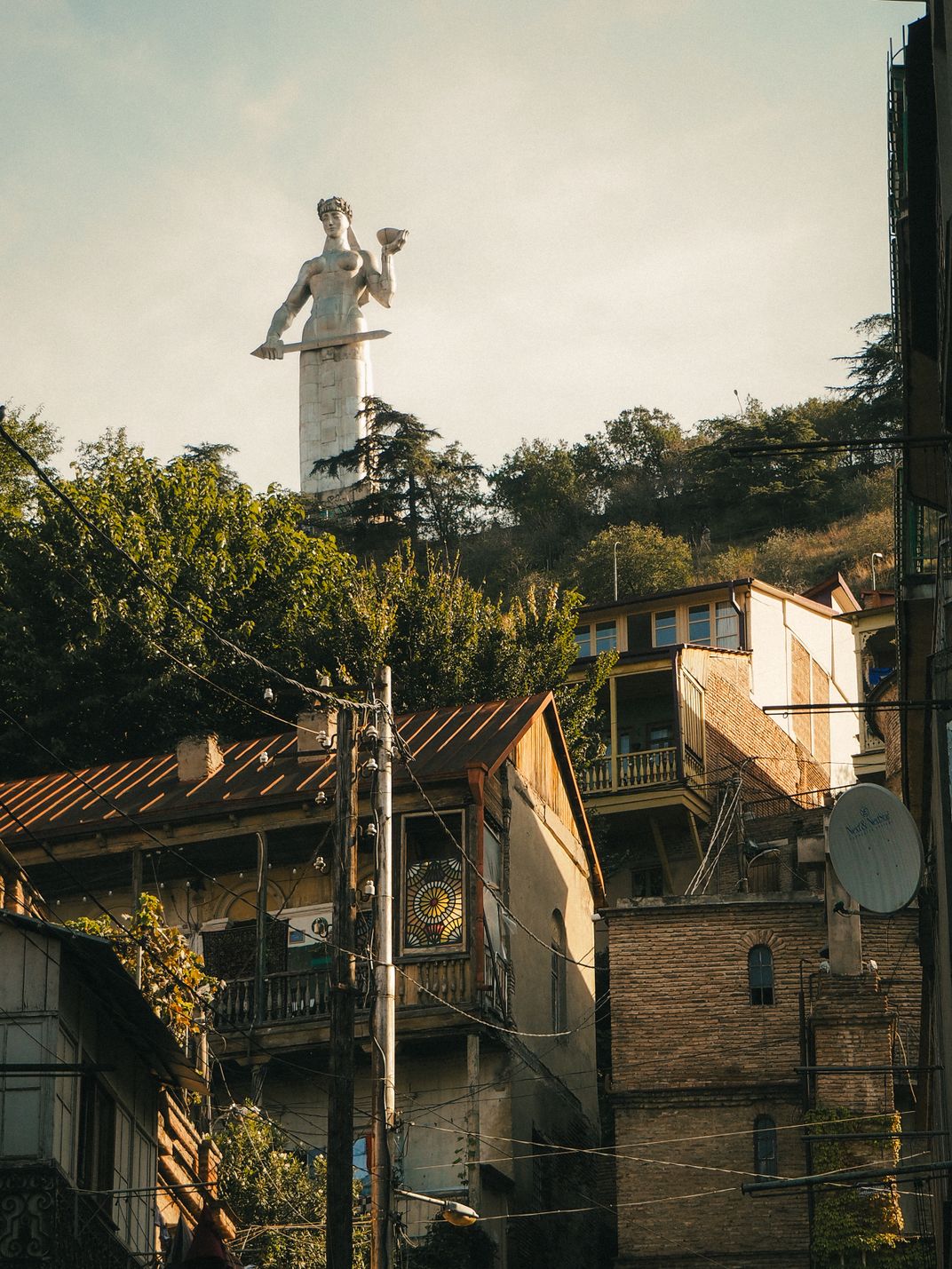 The famous statue in Tbilisi, Mother of Kartli, towers above the old houses.