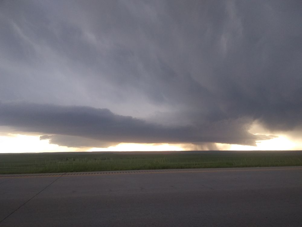 A massive supercell thunderstorm advances into Elbert and El Paso counties in Eastern Colorado, the wall cloud on the left produced a brief landspout tornado shortly before this photo was taken.