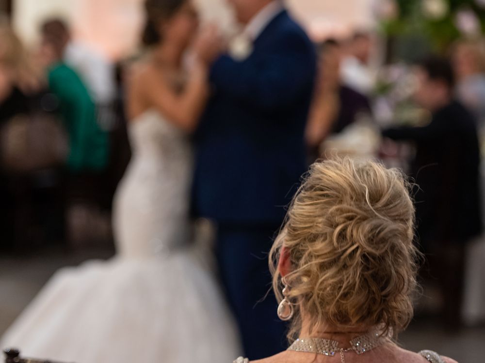 The bride's mother watches her daughter and husband during the father-daughter dance at a wedding.