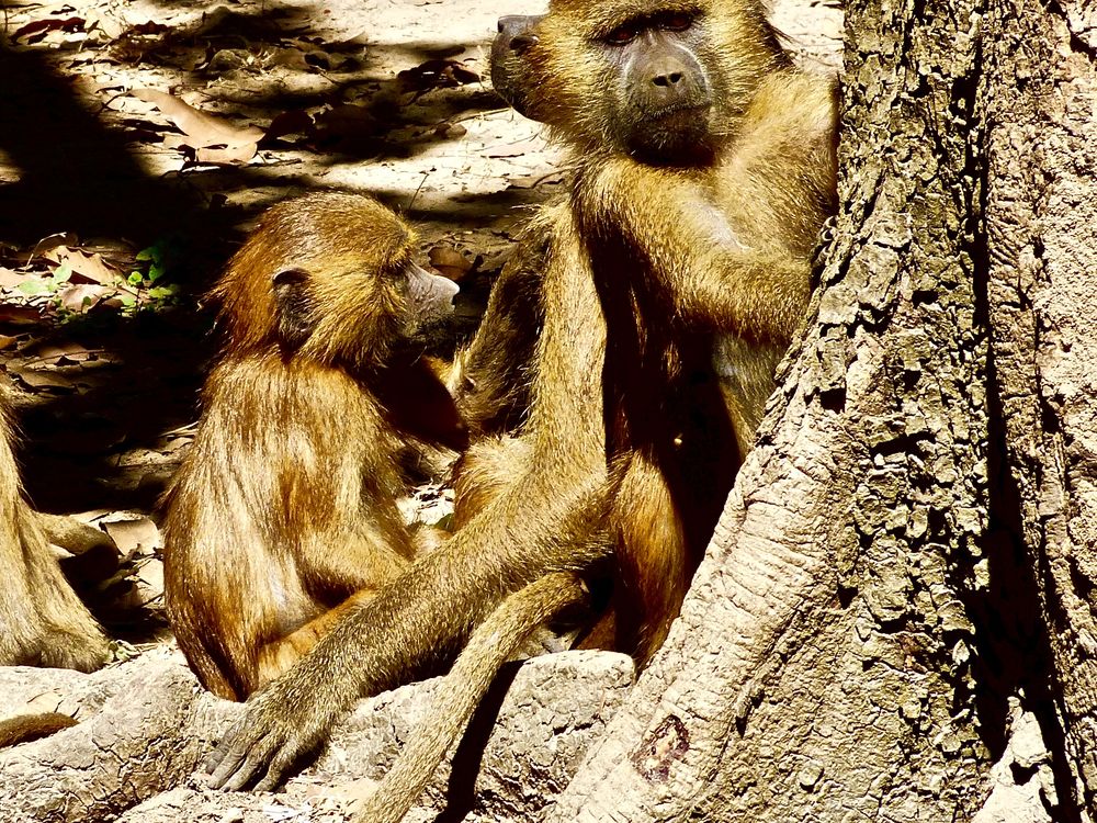 My tour bus driver drove me from Banjul to Brikama to the Makasutu Forest, the home of many Guinea baboons. The baboons run freely around on the forest floor. They are not agile in trees because they do not have prehensile tails capable of grasping. They spend most of the day grooming.