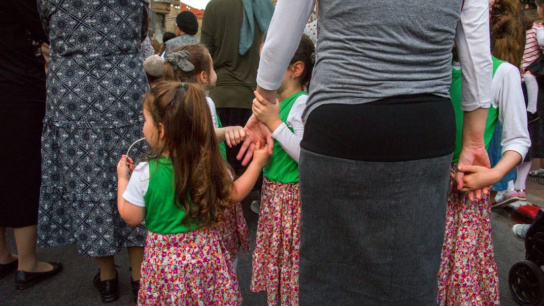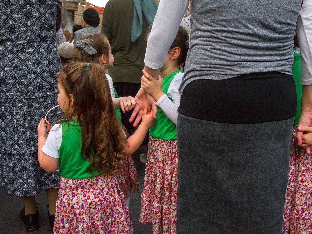 The insertion of a Torah scroll is a significant religious event. As part of the ritual, there is a procession through the local streets leading to the synagogue. A large crowd lines the parade route, and when the Torah scroll passes, those in attendance walk behind it.