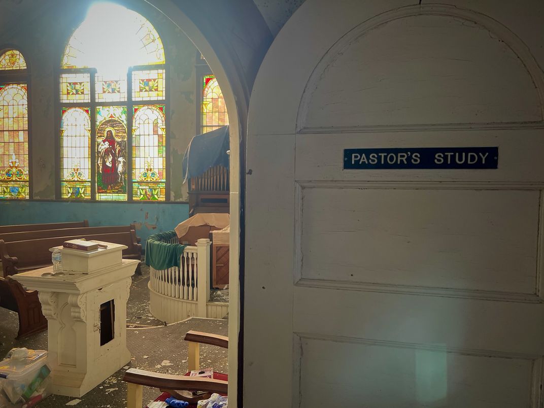 A view from the Pastor's Study door into the sanctuary of the historic Mount Zion Baptist Church in Athens, Ohio. This image captures the beauty of the stained-glass and the altar area, highlighting the intellectual and spiritual center of the Black community's historic gathering place.