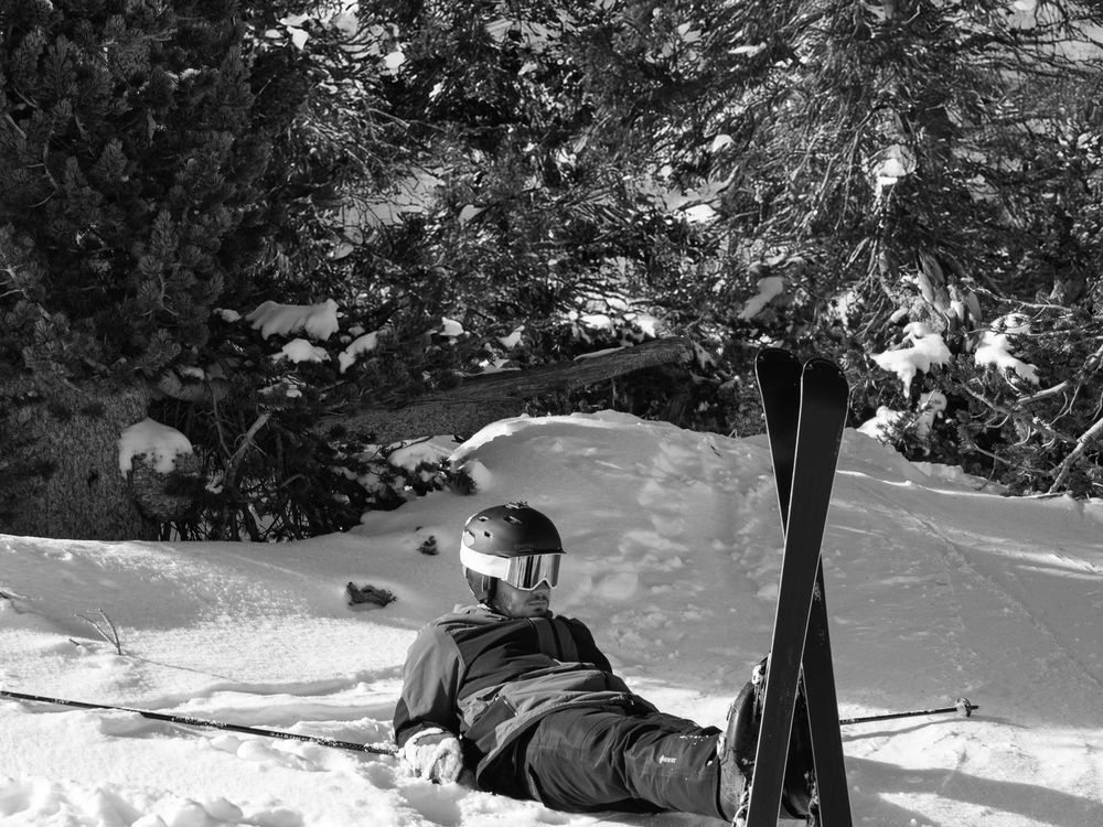 My brother and I were taking a quick break at the top of the mountain and watching other skiers head down the slope.