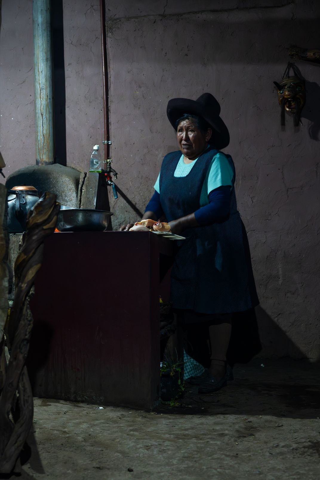A local woman stands in her rustic kitchen in a village nestled in the Sacred Valley of Peru. Wearing traditional Andean clothes and a broad-brimmed hat, she prepares ingredients by the light of a single lamp, surrounded by humble furnishings and earthen walls. Mountain villages in this region have preserved centuries-old customs, relying on agriculture, weaving, and communal rituals, with daily life centered on the land and strong bonds within the community.