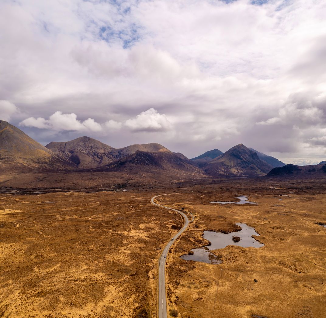 A winding road through the Isle of Skye with the Black Cuilins mountain range on the horizon. On the Isle fo Skye, Scotland.