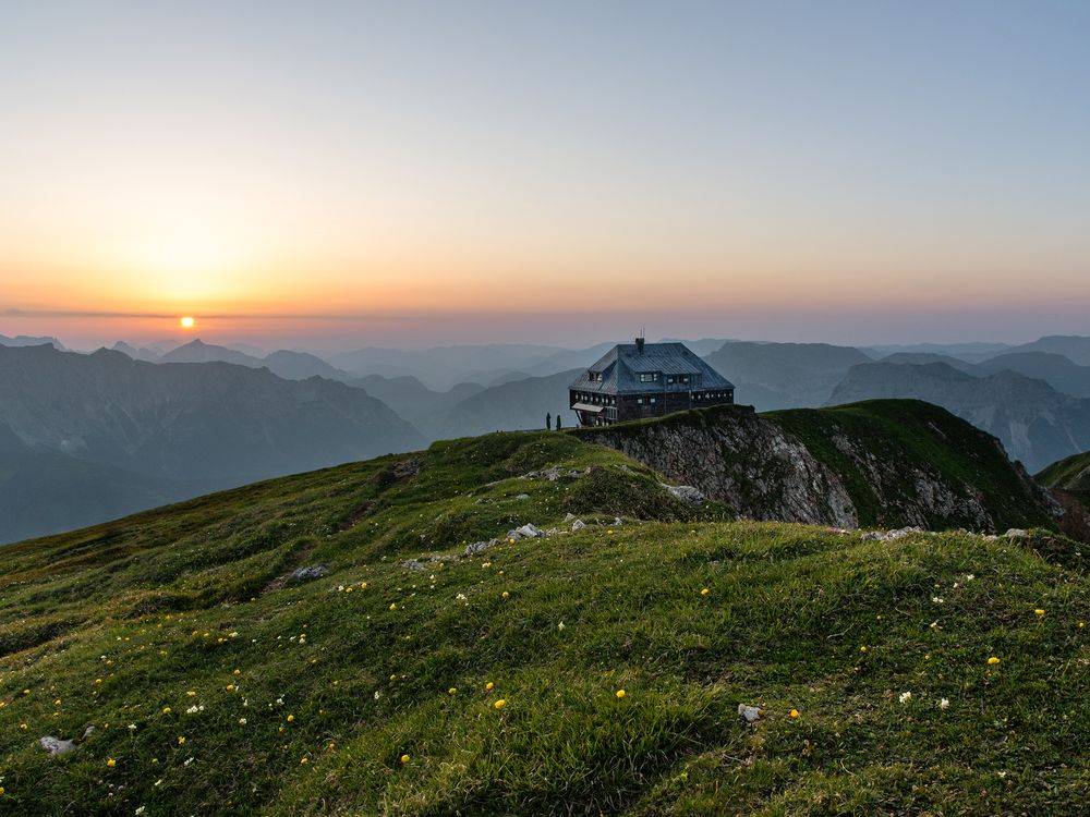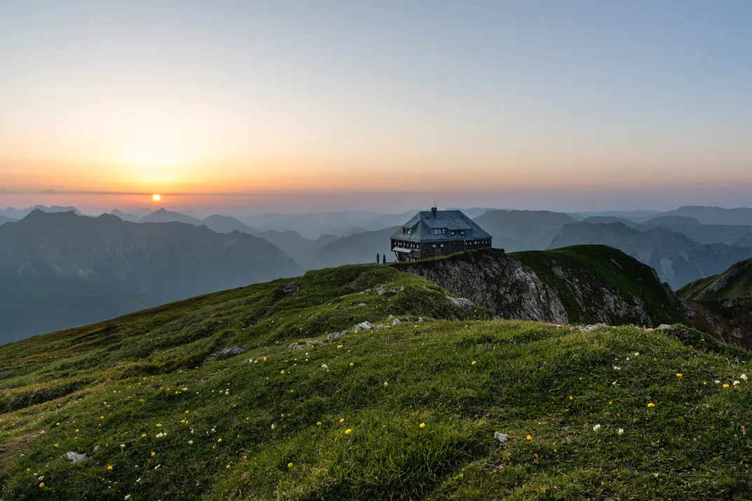 Perched on the brink of a dramatic alpine ridge, this solitary mountain hut stands bathed in the soft light of sunset. Captured in the remote highlands, the image conveys a sense of isolation, tranquility, and the vast majesty of nature, where human presence feels both humble and harmonious within the grand design of the mountains.