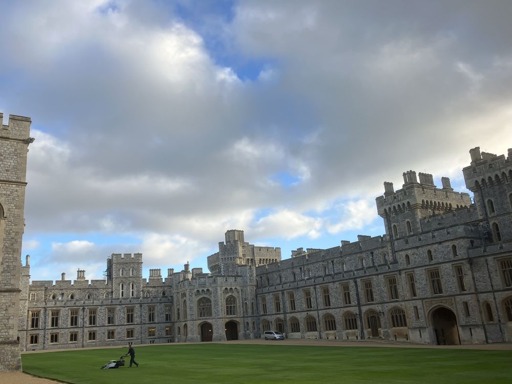 A man mows the lawn at Windsor Castle. It might take him a while....