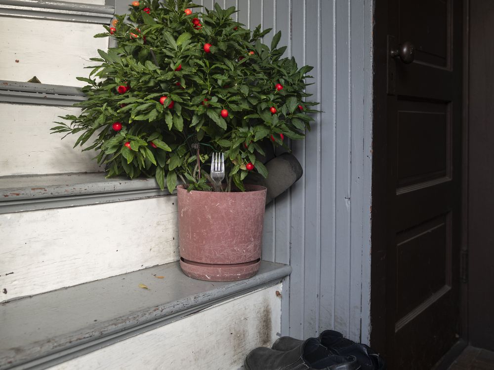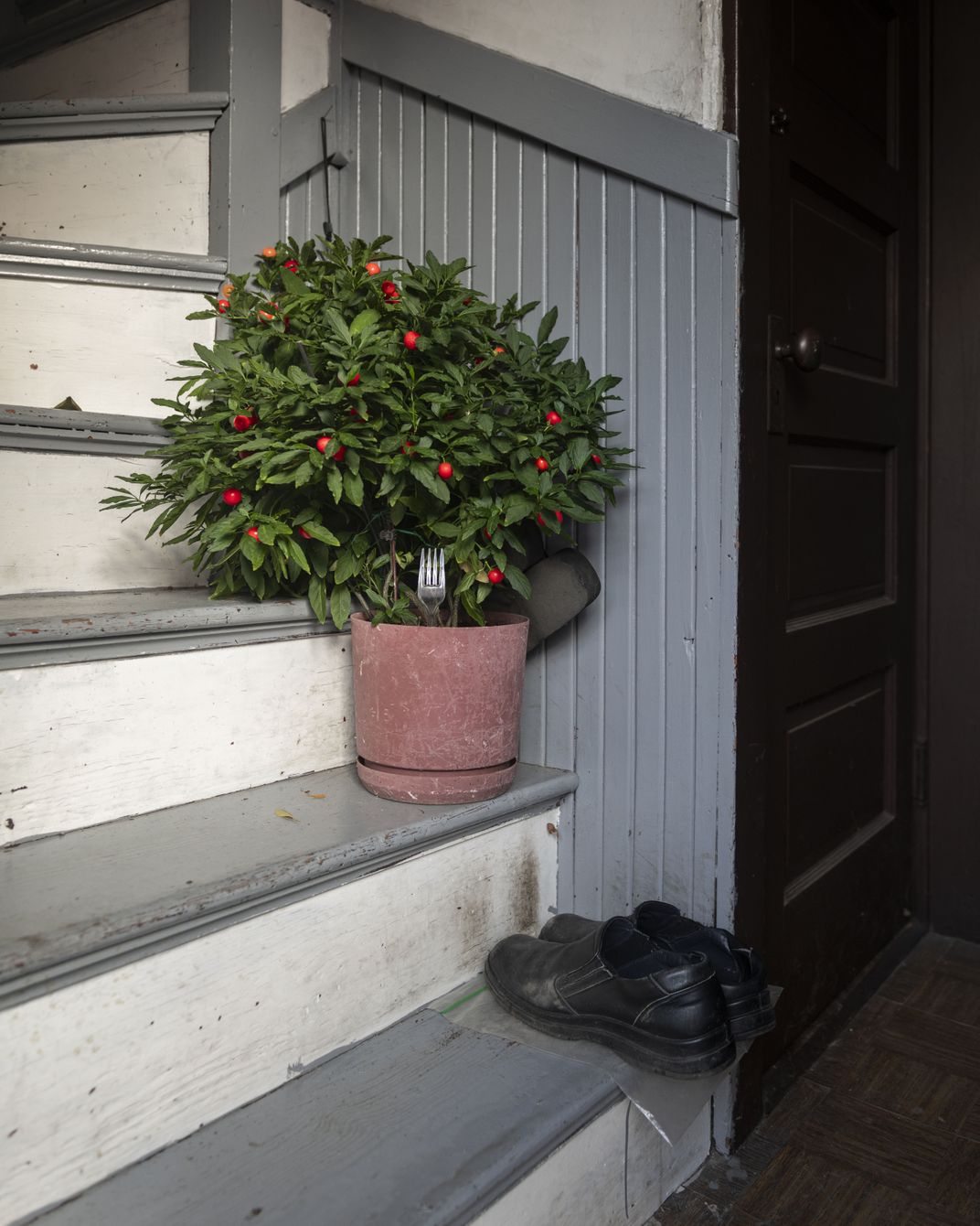 Mr. Lam leaves his gardening shoes on a plastic bag on the stairs. He leaves them with his wife's sandals.