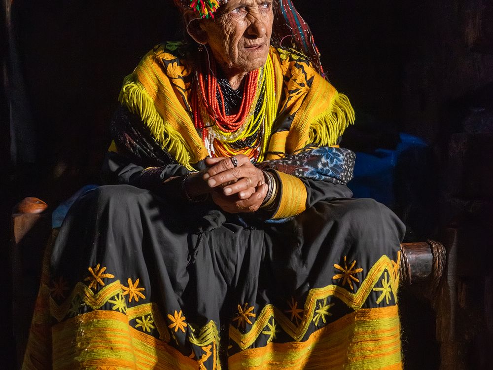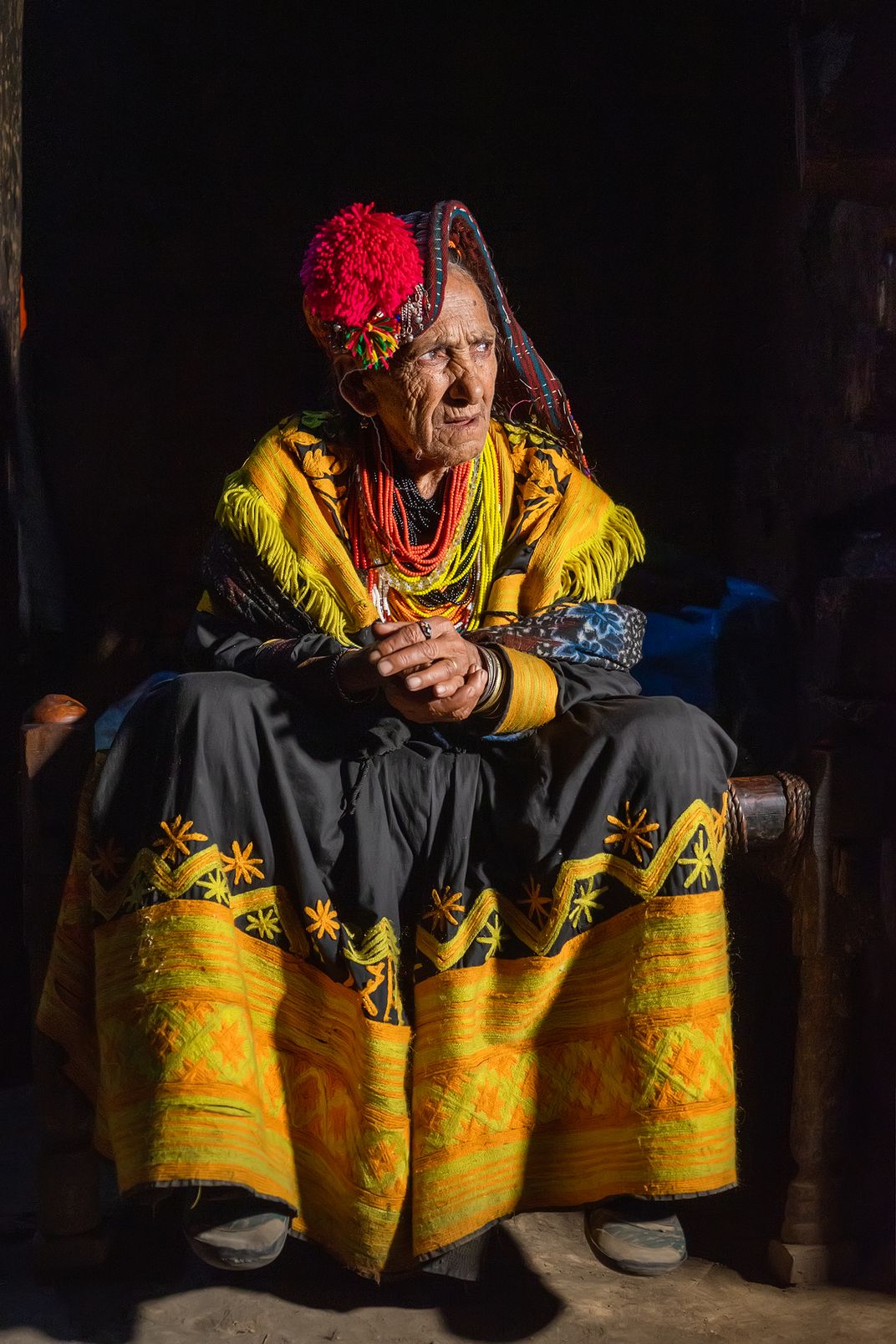 Her name is Bibi Jan, she is a Kalash woman, living in the Kalash Valley of Pakistan, neighbouring Afghanistan. Despite living in a very difficult geography, she is a member of the Kalash who has managed to maintain her traditions. The daily clothes of Kalash women are more colourful and decorated than their Muslim neighbours, women have a say in society and are respected. They do not cover their hair and wear headdresses decorated with seashells every day. They always braid their hair,regardless of their age.She's so happy to be a Kalash woman.