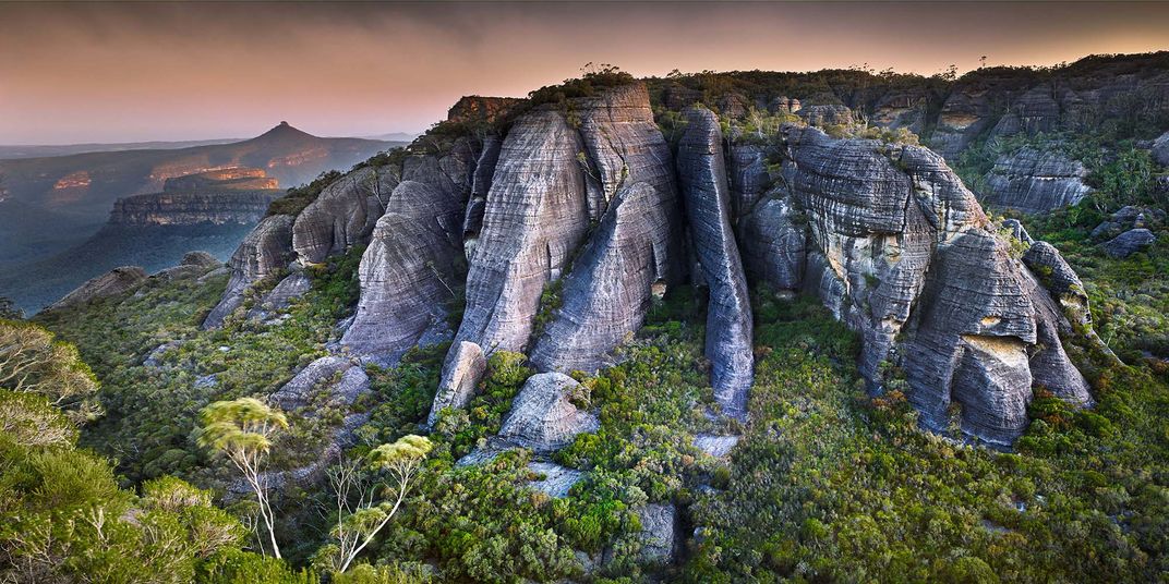 Inland from south coast of NSW Australia, lies a region of pristine wilderness, The Budawangs. This is an area of deep gorges, flat-topped mountain islands protected by rocky ramparts and untouched forests and creeks. The landscape has a “Lost World” quality. On a three day hike and after climbing a 500ft cliff in fading light I captured this sunset photograph of Mount Nibelung across Monolith Valley with the unmistakeable Pigeon House Mountain in the distance. I love “The Wangs”. It is right up there with some of the most challenging walks in Australia, the possibilities are endless and it’s a landscape photographer’s dream.