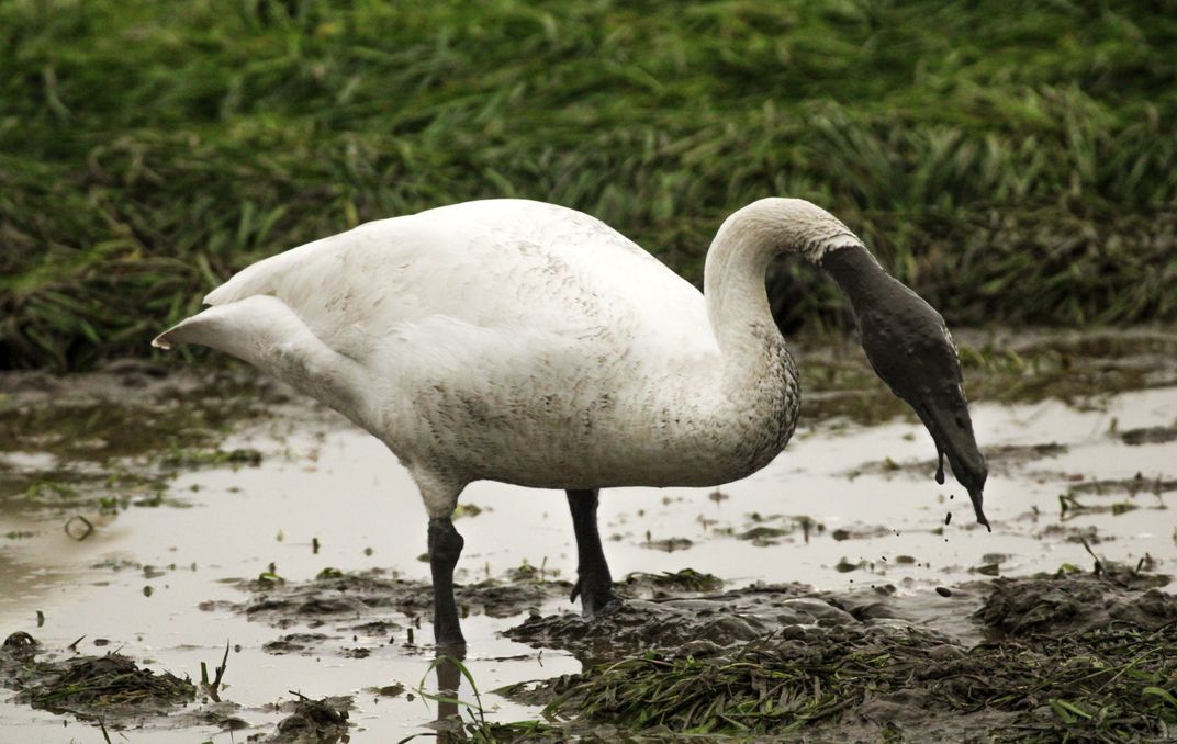 A Trumpeter Swan digging through the mud to find its lunch after a heavy rain in Skagit, Washington.