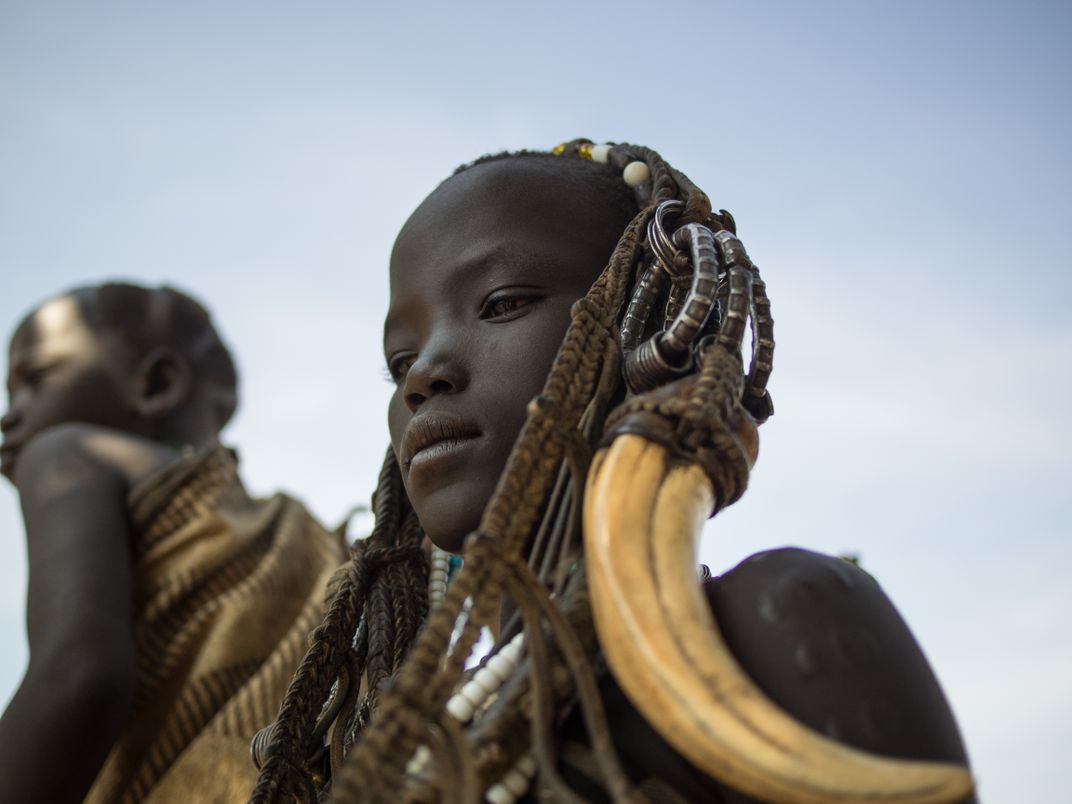 As Mursi boys and girls approach their full height, they begin to cut small notches into their skin which heal as decorative scars and remain on their bodies for life.